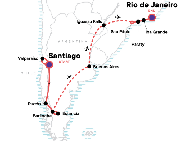 Your Discover Moment: Ilha Grande. City tour of Santiago. Driving through the Seven Lakes district. Estancia visit and barbecue lunch (full-day). Iguassu Falls visit (Brazil and Argentina). Local flights. All transport between destinations and to/from included activities.