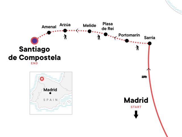 Your Welcome Moment: Welcome Moment - Meet Your CEO and Group. Orientation walk in Madrid. Trekking along the pilgrimage route of Santiago de Compostela (6 days). Luggage transport throughout. Transport between Madrid and the start of the trek.
