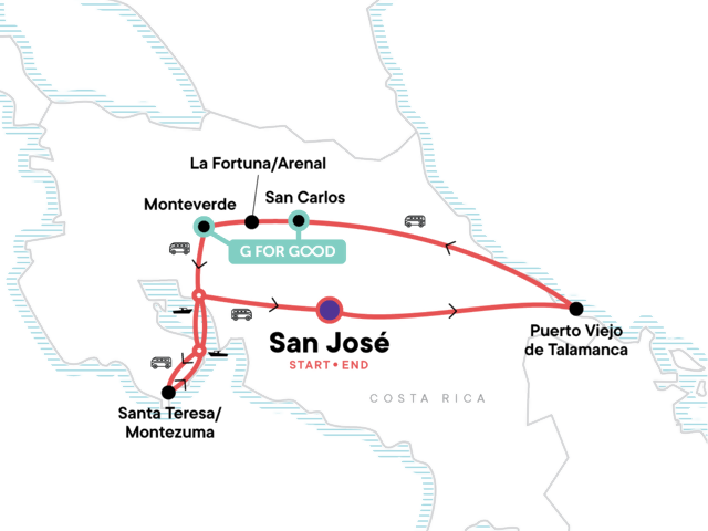 Your Discover Moment: Monteverde. Beach time in Puerto Viejo and Santa Teresa. Free time in La Fortuna and Monteverde. All transport between destinations and to/from included activities.