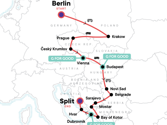 Your Discover Moment: Budapest. Auschwitz entrance and guided tour (Krakow). Orientation walk of Prague. Vienna walking tour. Petrovaradin Fortress visit. Kalemegdan Fortress visit (Belgrade). "Tunnel of Life" tour (Sarajevo). Mostar stay. Sea kayaking trip (Bay of Kotor). Beach time in Hvar. Scenic boat ride around Pakleni islands. Diocletian's Palace guided tour (Split). All transport between destinations and to/from included activities.