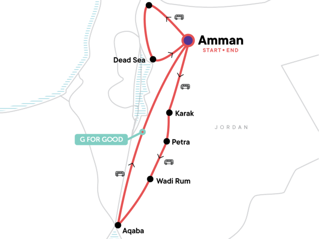 Your Local Living Moment: Bedouin Camp Overnight, Wadi Rum. Jerash guided tour. Dead Sea visit. Visit Madaba mosaics and Mt Nebo. Karak Castle guided tour. Petra guided tour. Wadi Rum 4x4 excursion. Red Sea stay. Entrance fees in all included tours. All transport between destinations and to/from included activities.