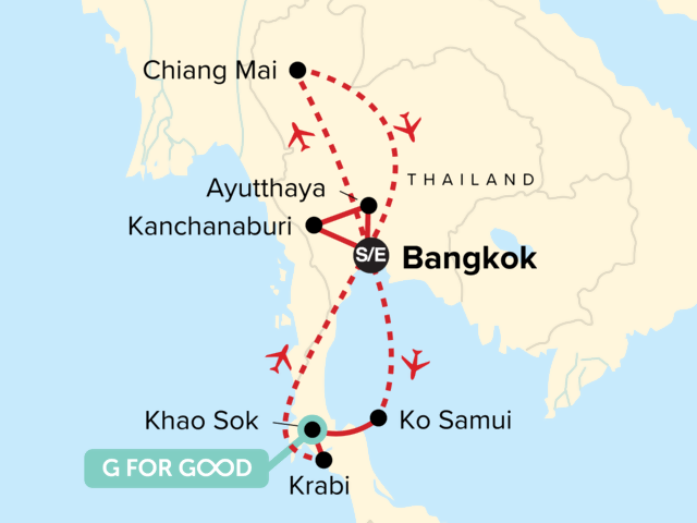 Experience the timeless grandeur of Thailand’s cities, temples, and landscapes on a cross-country adventure. Explore the rich cultural heritage and culinary delights of Chiang Mai, then head south to discover tropical coastlines. Stroll the sun-drenched shores of Ko Samui, and venture to limestone cliffs and sacred caves in Krabi. In each destination, marvel at intricate palaces and monasteries, meet locals in village homes and traditional workshops, and delight in the flavours of authentic Thai cuisine.