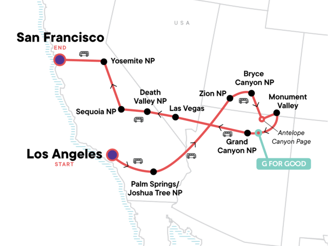 Your Welcome Moment: Welcome Moment - Meet Your CEO and Group. Joshua Tree National Park visit. Zion National Park. Bryce Canyon National Park visit. Horseshoe Bend and Antelope Canyon visits. Navajo guided Monument Valley jeep tour. Full day hiking in Grand Canyon National Park. Drive Route 66 drive. Death Valley National Park visit. Sequoia National Park visit. Yosemite National Park visit. Entrance fees to all national parks and monuments with hiking and walking excursions. All transport between destinations and to/from included activities.