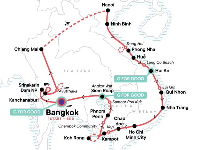 Your Foodie Moment: Ho Chi Minh City Street Food Crawl, Ho Chi Minh City. Bangkok Klong Riverboat Tour. Visit Hellfire Pass and Ride the Death Railway. Visit Bridge on the River Kwai and Thai/Burma Railway Centre and Allied War Cemetery. Visit a Local Rice Farm. Ayutthaya Cycling. Boat Tour. Chiang Mai Old Town Orientation Walk. Chiang Mai Night Market Walk. Sunrise Alms Giving. Doi Suthep Temple Visit. Hanoi Old Town Cyclo Tour. Bia Hoi Corner and Microbrewery Crawl. Hanoi Foodie Culture Tour. Tam Chuc Pagoda Tour. Dong Hoi Wet/Fish Market tour and countryside cycling. Vinh Moc Tunnels Tour. An Bang Cemetery Tour. Visit Lang Co Beach. Hai Van Pass and Marble Mountain Tour. Hoi An Old Town Walk and Riverside Evening Out. Dinner at one of the stylish restaurants in the ancient town of Hoi An. Thap Doi Cham Temples Visit. Eoi Gio Coastal Walk. Beach Time at Qui Nhon and Nha Trang. Visit Gành Đá Dĩa. Ho Chi Minh City Walking Tour including Ben Thanh Market. Karaoke Night. Motorbike tour including Hang Pagoda and Sam Mountain. Chau Doc floating market. Kep market walk. Tour of Monivong Bokor NP. Tour of Chambok Community with traditional lunch. Phnom Penh cyclo tour and dinner at one of best restaurants in Phnom Penh. Visits to Skun Market and Santuk Silk Farm. Tour of Sambor Prei Kuk Ancient Site. Visit Rong Klua Market. Visit Wat Sothorn Wararam Woraviharn. Walk and night out on Khao San Road. All transport between destinations and to/from included activities.