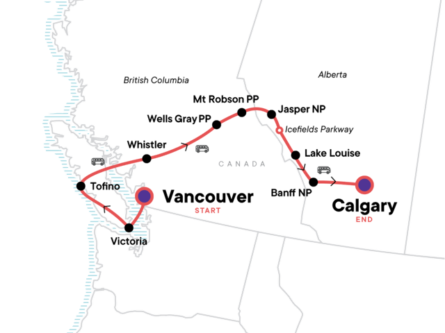 Your Big Night Out Moment: Wells Gray Park. Entrance fees to all national and provincial parks with walking and hiking excursions. Stop at Columbia Icefield. Half-day canoe tour in Wells Gray Provincial Park. Half-day whale watching tour by Zodiac. Self-inflating mattresses and dome tents. All transport between destinations and to/from included activities.