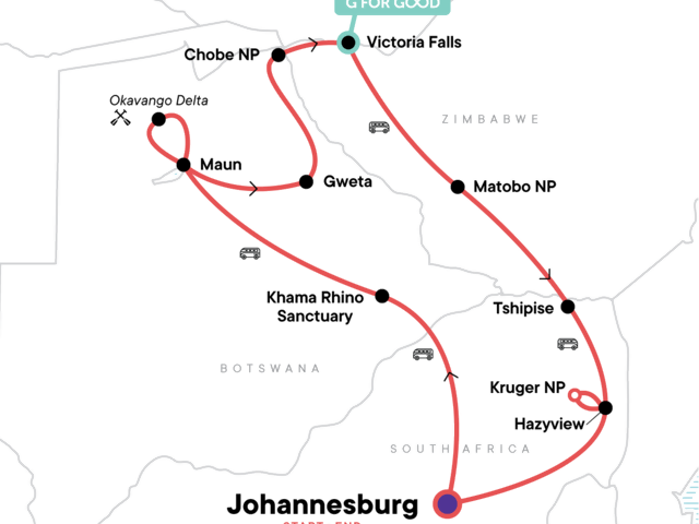 Your Discover Moment: Victoria Falls. Khama Rhino Sanctuary Drive. Okavango Delta overnight bush camping excursion. Guided walk and open vehicle safari drive in Matobo NP. Kruger NP entrance with wildlife safari drives in the Lando. Traditional dinner and local dancing. All transport between destinations and to/from included activities.