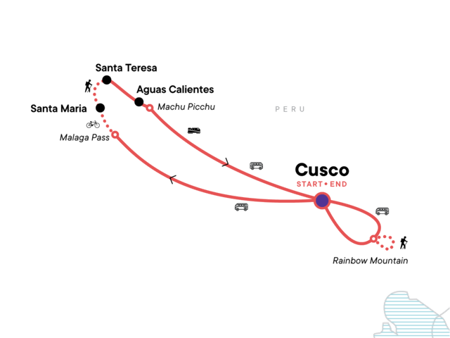 Your First Night Out Moment: Connect With New Friends. Mountain Biking (Malaga High Pass). Santa Teresa hike. Ziplining. Train to Aguas Calientes. Guided tour of Machu Picchu. Rainbow Mountain hike. All transport between destinations and to/from included activities.