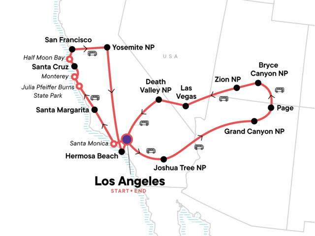 Your Welcome Moment: Welcome Moment - Meet Your CEO and Group. Hike in Julia Pfeiffer Burns State Park. San Francisco orientation tour. Yosemite National Park visit. Nevada and Vernal Fall hike. Tuolumne Grove of Giant Sequoias. Surf lesson. Visit to Joshua Tree National Park. Drive along Route 66. Hike in Grand Canyon National Park. Visit to Horseshoe Bend. Bryce Canyon National Park visit. Zion National Park visit. Free time in Las Vegas. Death Valley National Park visit. Entrance fees to all national parks and monuments with hiking and walking excursions. Self-inflating mattresses and dome tents. All transport between destinations and to/from included activities.